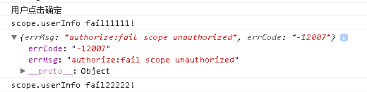 {errMsg: "authorize:fail scope unauthorized", errCode: "-12007"}