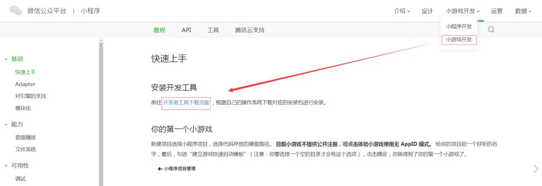 1. 开发者工具下载:登录微信公众平台(mp.weixin.qq.com)首页 -> 点击“文档”-> 点击“开发”中的“小游戏开发”-> 前往开发者工具下载界面下载开发者工具。