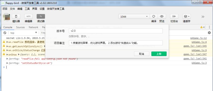 5. 小游戏的管理员进入开发者工具,可点击左上角的“工具”->再点击“上传”进入上传页面,填写游戏版号和项目备注完成代码上传。