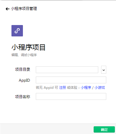 3. 开发者工具创建小游戏项目:小程序的管理员或已绑定的开发者可以创建项目,需要填写AppID,项目名称及本地开发目录。