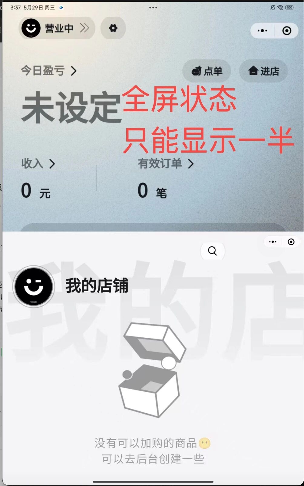 1、相同的小程序,先用半屏打开,样式正常,退出用全屏方式进入,打开后依旧是半屏状态
