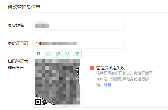 绑定管理员身份提示这个,但记不起微信开放平台绑定过哪个账号了