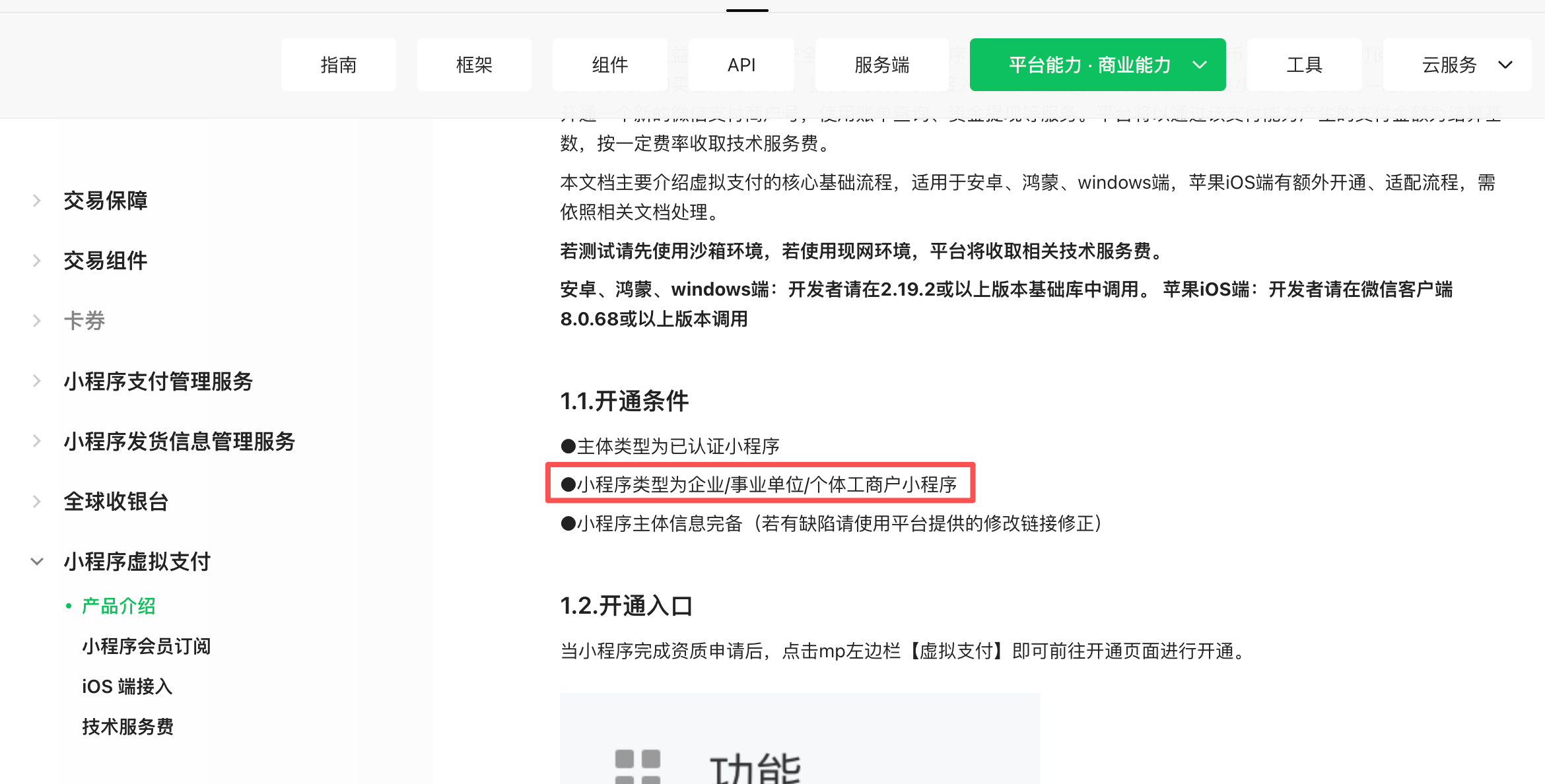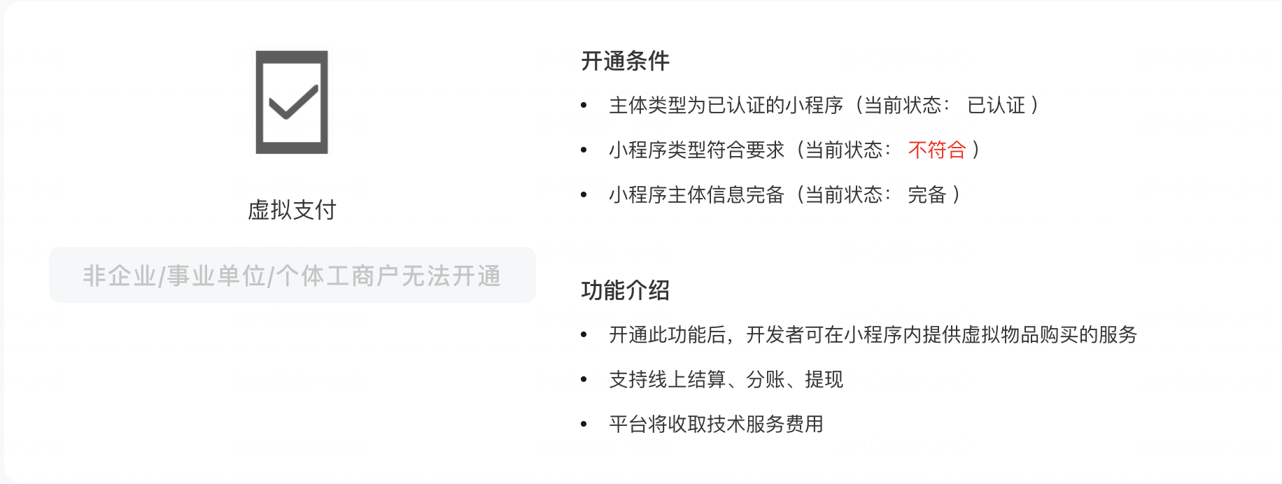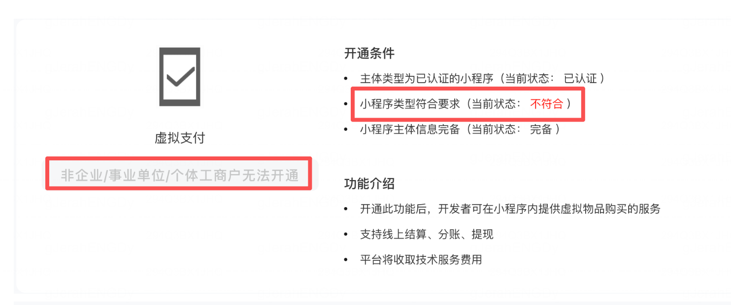 但在申请虚拟支付时,后台依然提示“小程序类型不符合(非企业/事业单位/个体工商户无法开通)”。