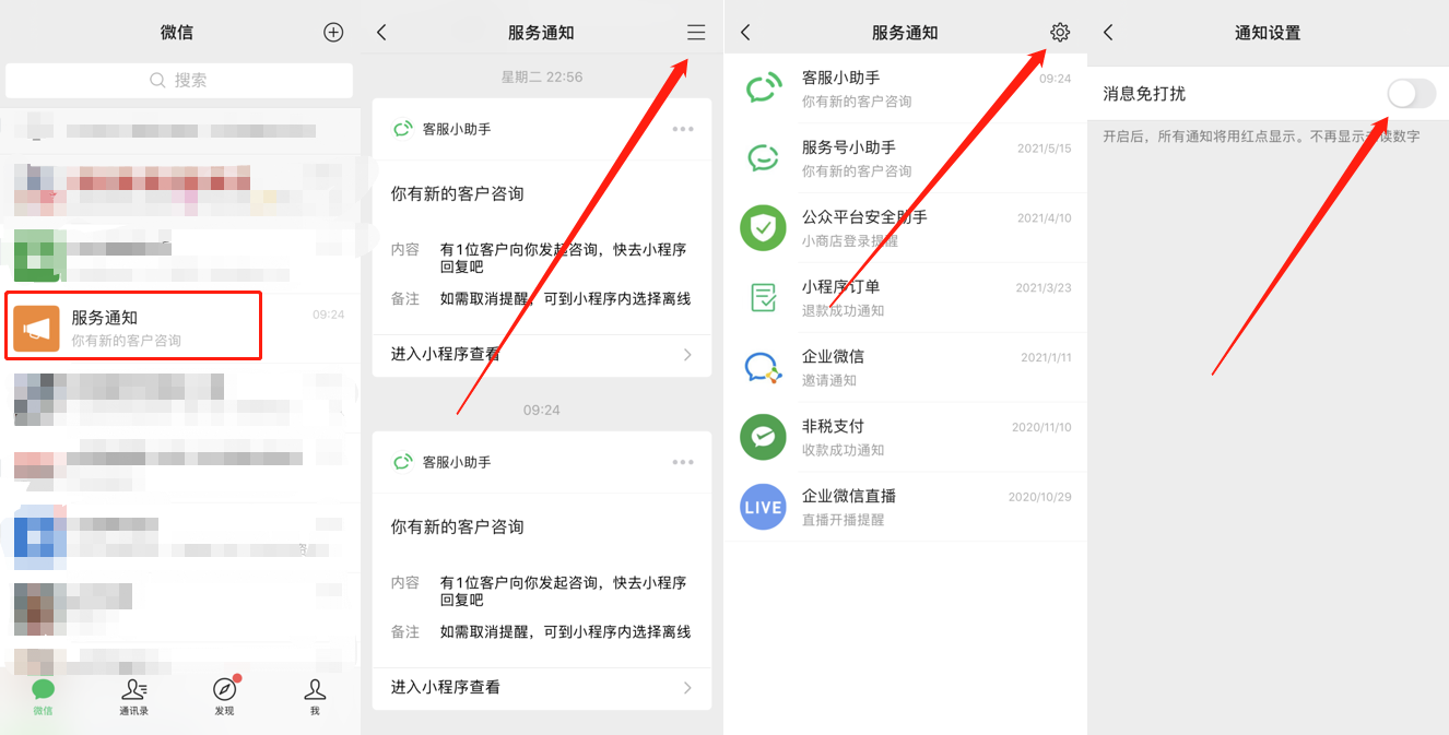 你好,首先确保服务通知中的消息免打扰是关闭的,如下图。