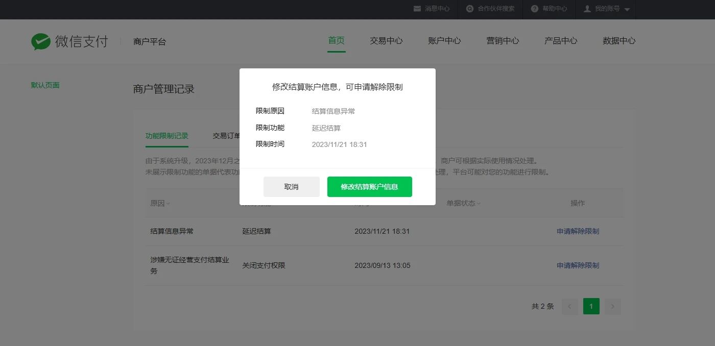按如图1提示操作,申请解除限制->修改结算商户信息,确认已通过审核,为什么还是没有解除限制?运营账户里的余额还是无法提现?