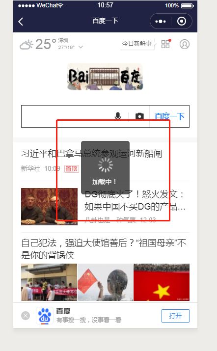 在页面加载完百度页面前,有加载中提示,在加载完后,触发bindload函数,隐藏加载中提示。但开发工具中并没有触发bindload方法,导致无法隐藏加载中提示