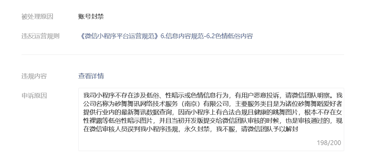 我开发的砂舞舞厅小程序主要为广大舞蹈爱好者提供合法公开的跳舞舞讯资讯服务,结果被微信团队判断为涉嫌低俗被封号,我很冤枉。