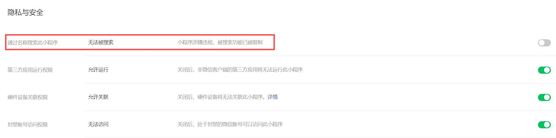 “小程序涉嫌违规,被搜索功能已被限制”,但在违规记录内未找到相关记录,请问如何解决