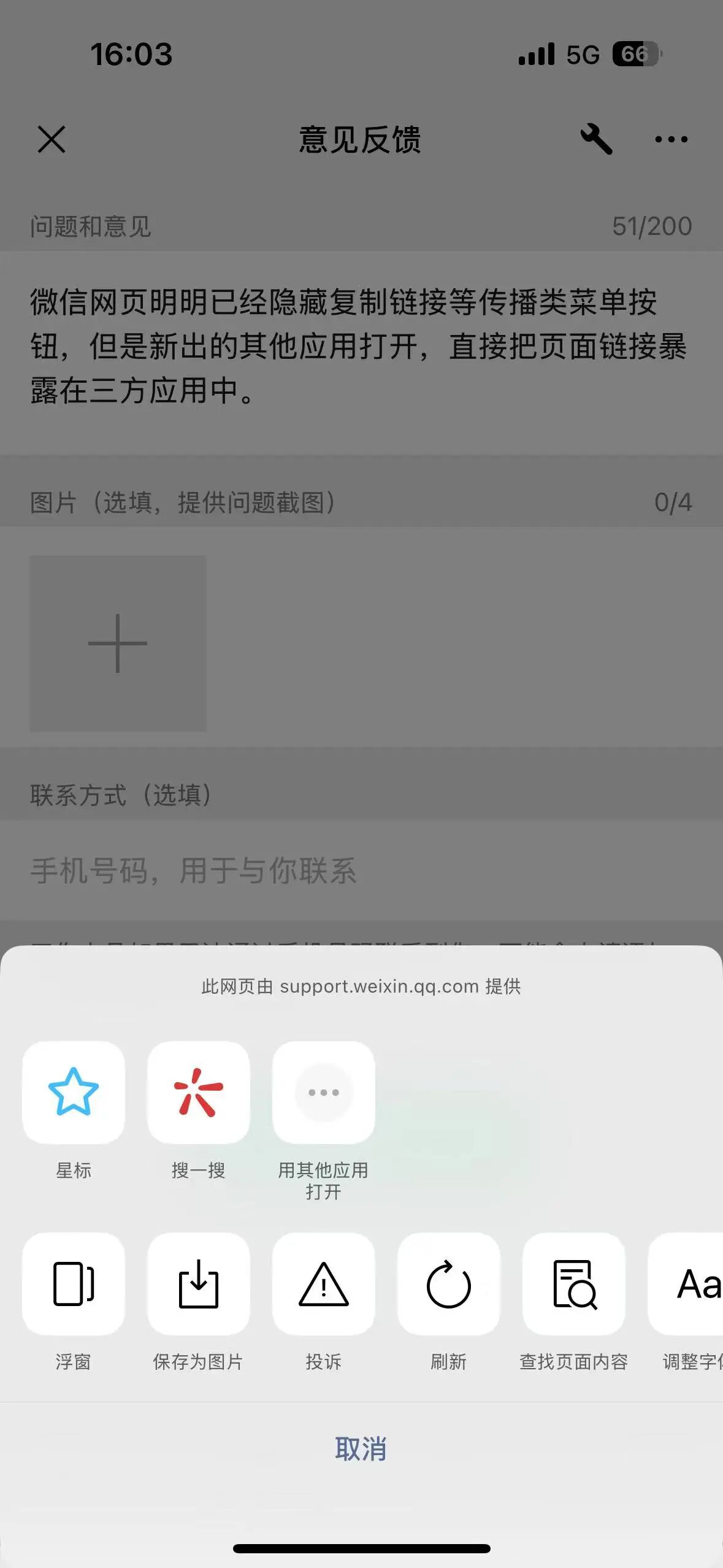 微信网页明明已经隐藏复制链接等传播类菜单按钮,但是用“其他应用打开”,直接把页面链接暴露在三方应用中?