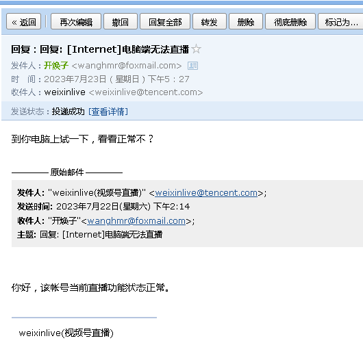 微信视频号直播相关问题咨询和反馈,请以“视频号直播问题咨询”为主题 附上帐号资料与问题描述发送到邮箱weixinlive@tencent.com