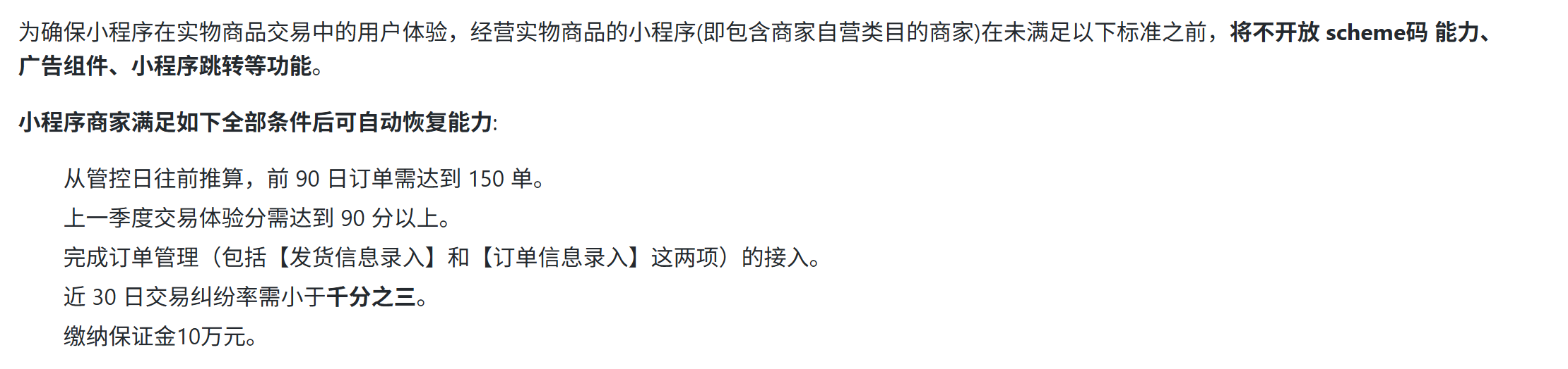 新注册的小程序误选择了商家自营类目 实际我们是电商平台,限制发了通知实物交易类小程序限制 跳入跳出功能?我的需求只是要求可以从A小程序跳转到 这个实物交易类小程序即可!那现在是不是不能从A跳入B了呢?