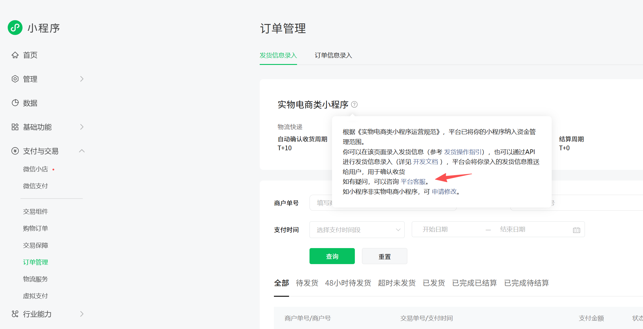 可前往小程序管理后台https://mp.weixin.qq.com/ 支付与交易-订单管理-发货信息录入/订单信息录入-【实物电商类小程序】旁边的问号-平台客服咨询