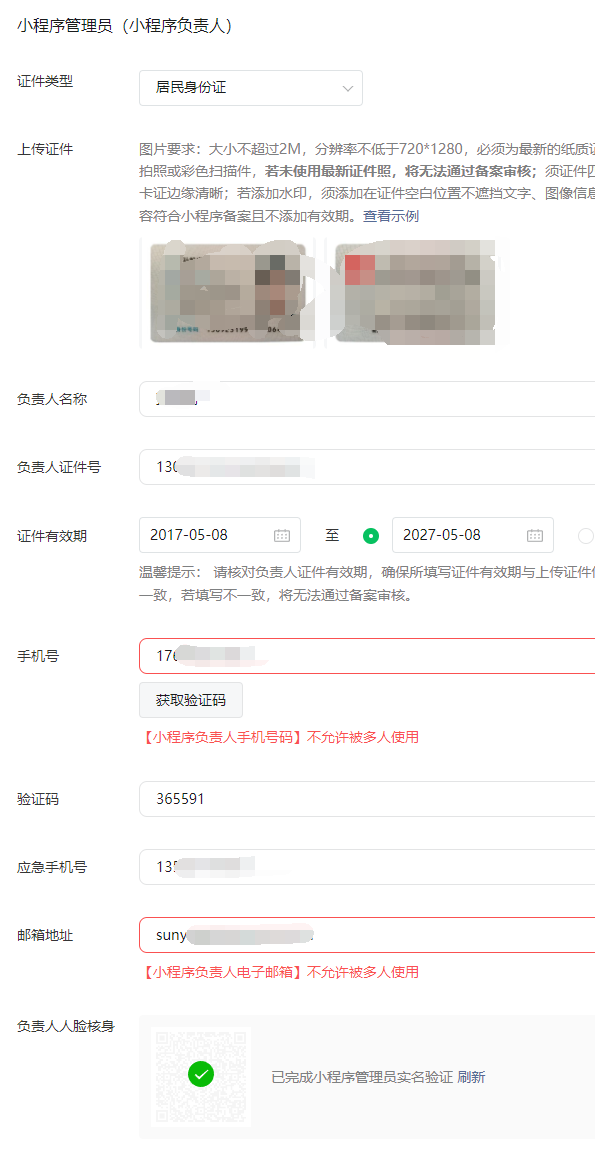 - 按以上可得出结论,我本次备案不应提示【小程序负责人手机号码】不允许被多人使用,才对,所以比较头大,希望尽快解决