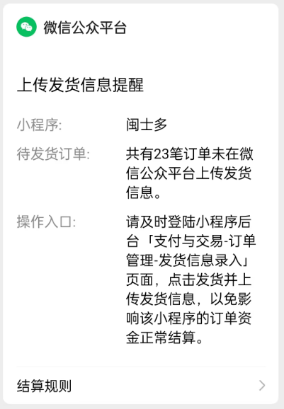 1、提供实物商品或盲盒商品的在线销售及配送相关服务(包括但不限于物流快递、同城配送、自提等方式)的小程序,需接入订单发货管理功能,交易默认冻结订单资金,商家需在平台上传发货信息,订单资金将在用户主动/系统自动确认收货后进行结算。可参考《实物电商类小程序运营规范》