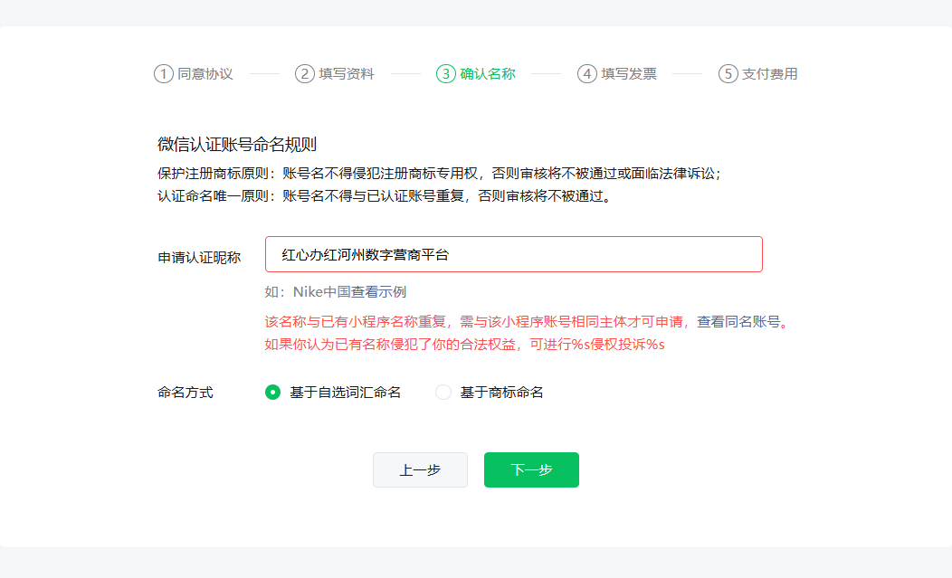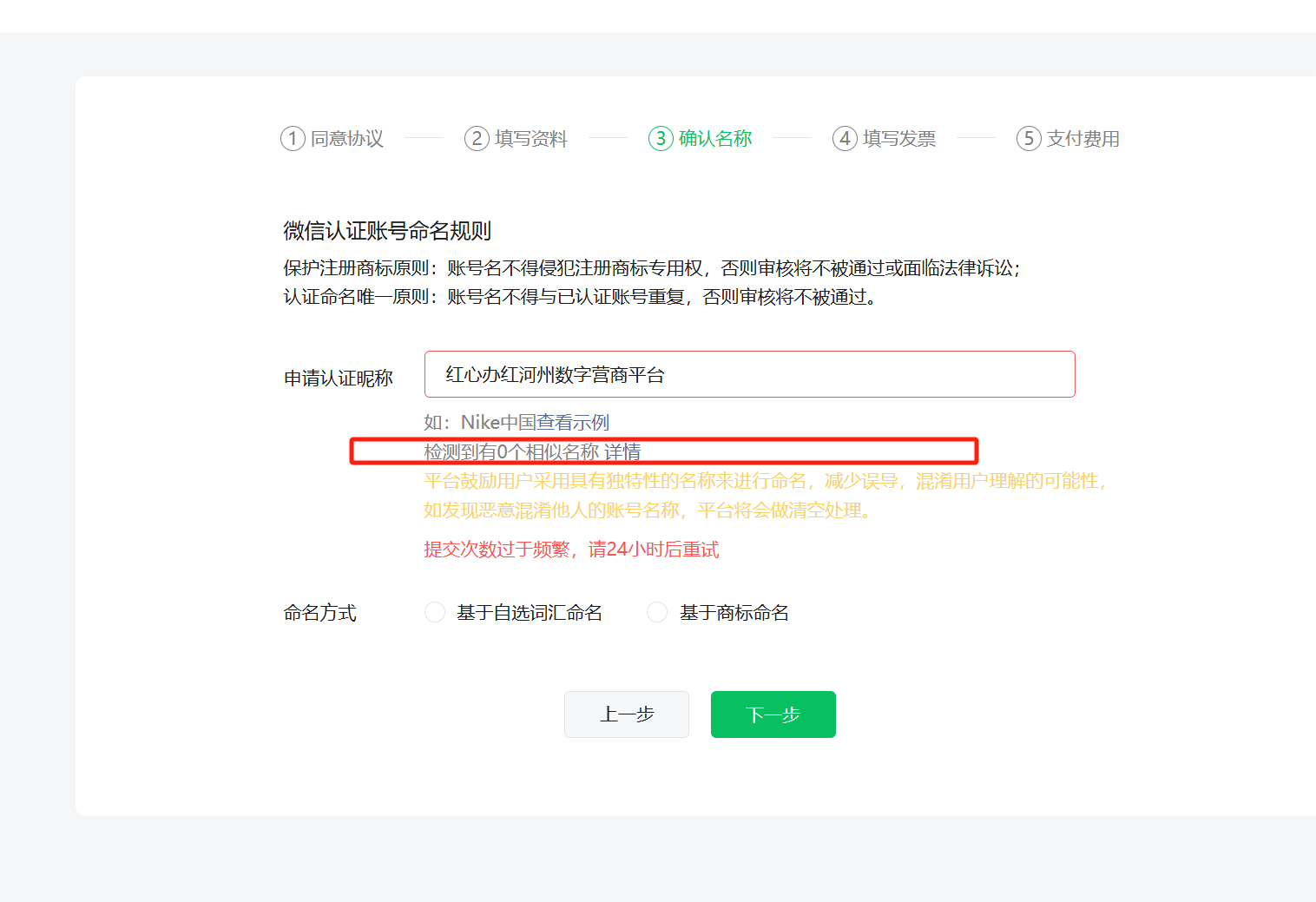 查看同名账号,如果没有商标的话,建议换一个名字。