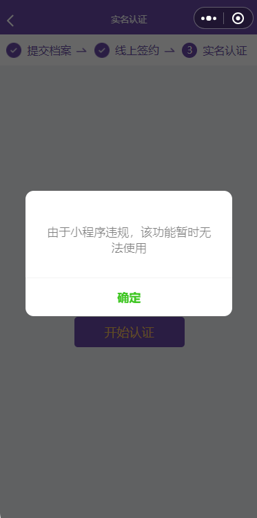 我司的小程序申请了腾讯云的人脸认证功能,但是在调起该人脸认证功能时,弹出提示“由于小程序违规,该功能暂时无法使用”。