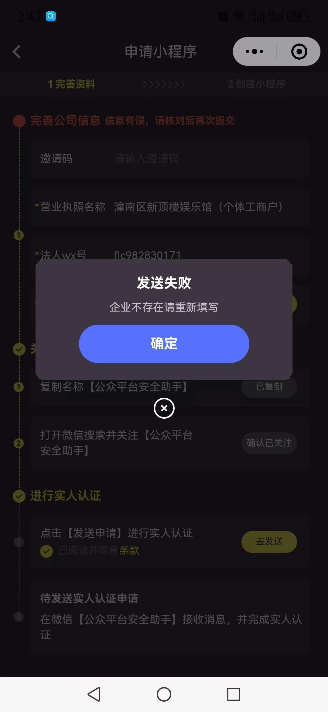 注册小程序时,工商数据返回:“发送失败 企业不存在请重新填写”。
