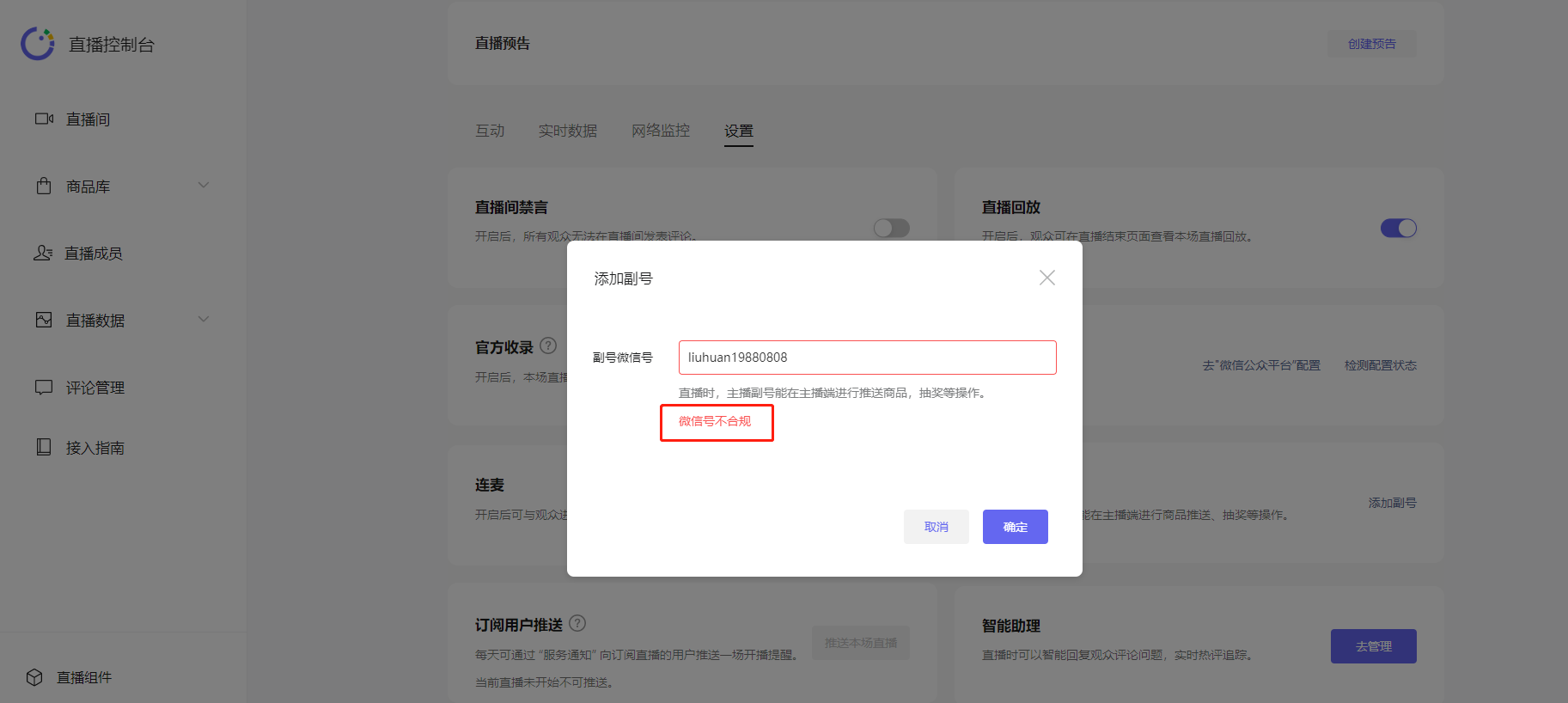 我在微信直播控制台,添加主播副号这里,填写正常的微信号,提示 “微信号不合规”,可以帮忙解决一下吗?