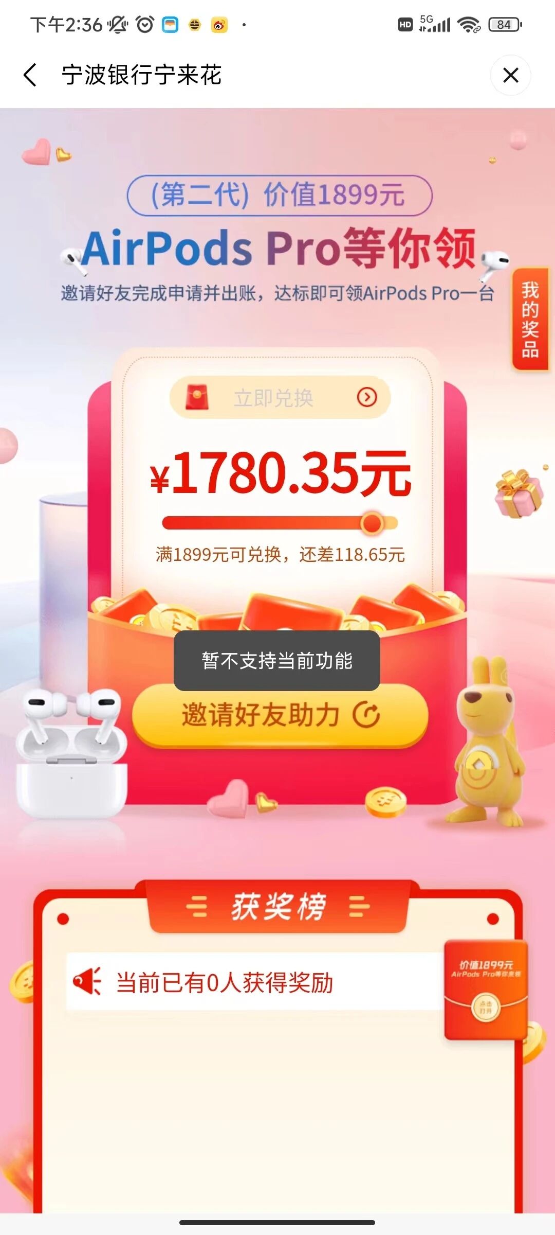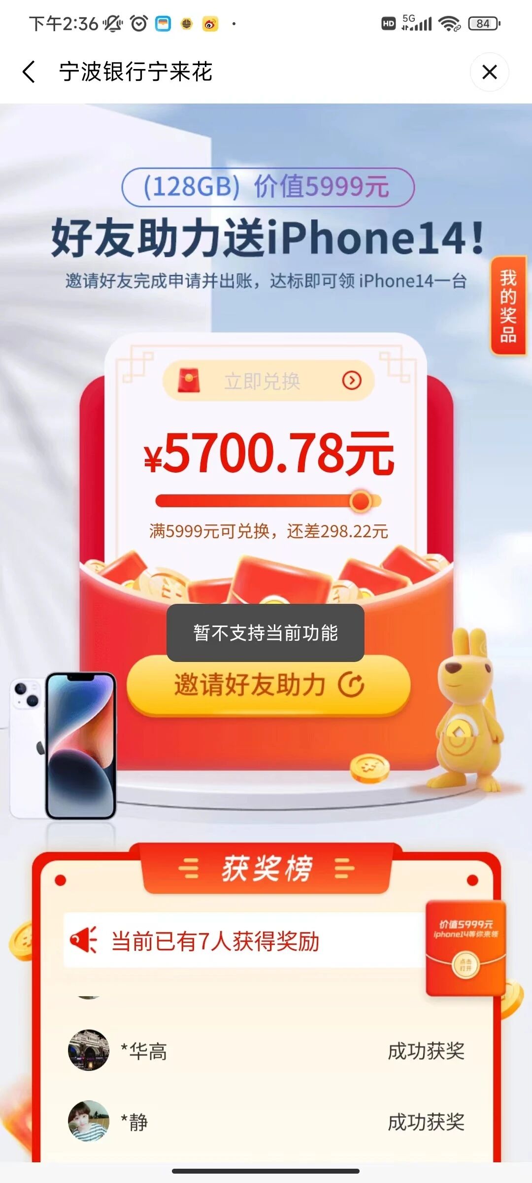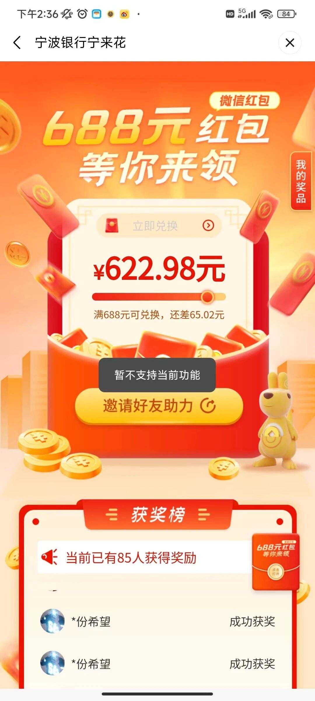 5. 问题描述:进入宁来花视频号主页,点击“欢乐拼拼”,再点击“活动专区”,再点击“688微信红包或任意一个活动的立即参与”,再点击“邀请好友助力”,会显示“暂不支持当前功能”。