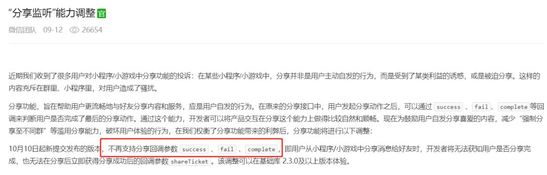 根据官方的文档描述,分享接口将不再支持success 、fail 、complete