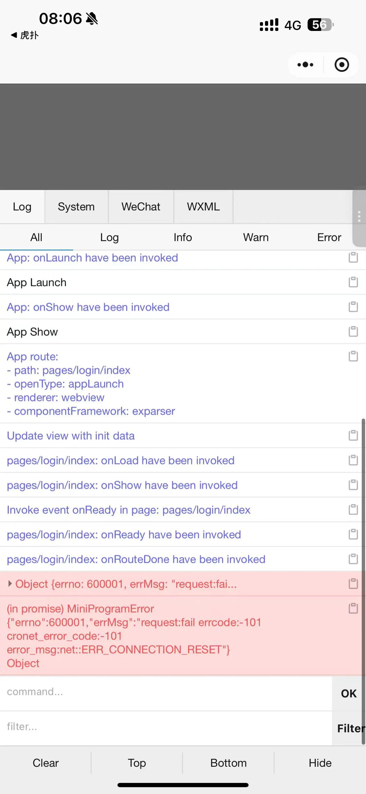 用户登录显示(in promise) MiniProgramError{"errno":600001,"errMsg":"request:fail errcode:-101cronet_error_ code:-101error_msg:net::ERR CONNECTION RESET")