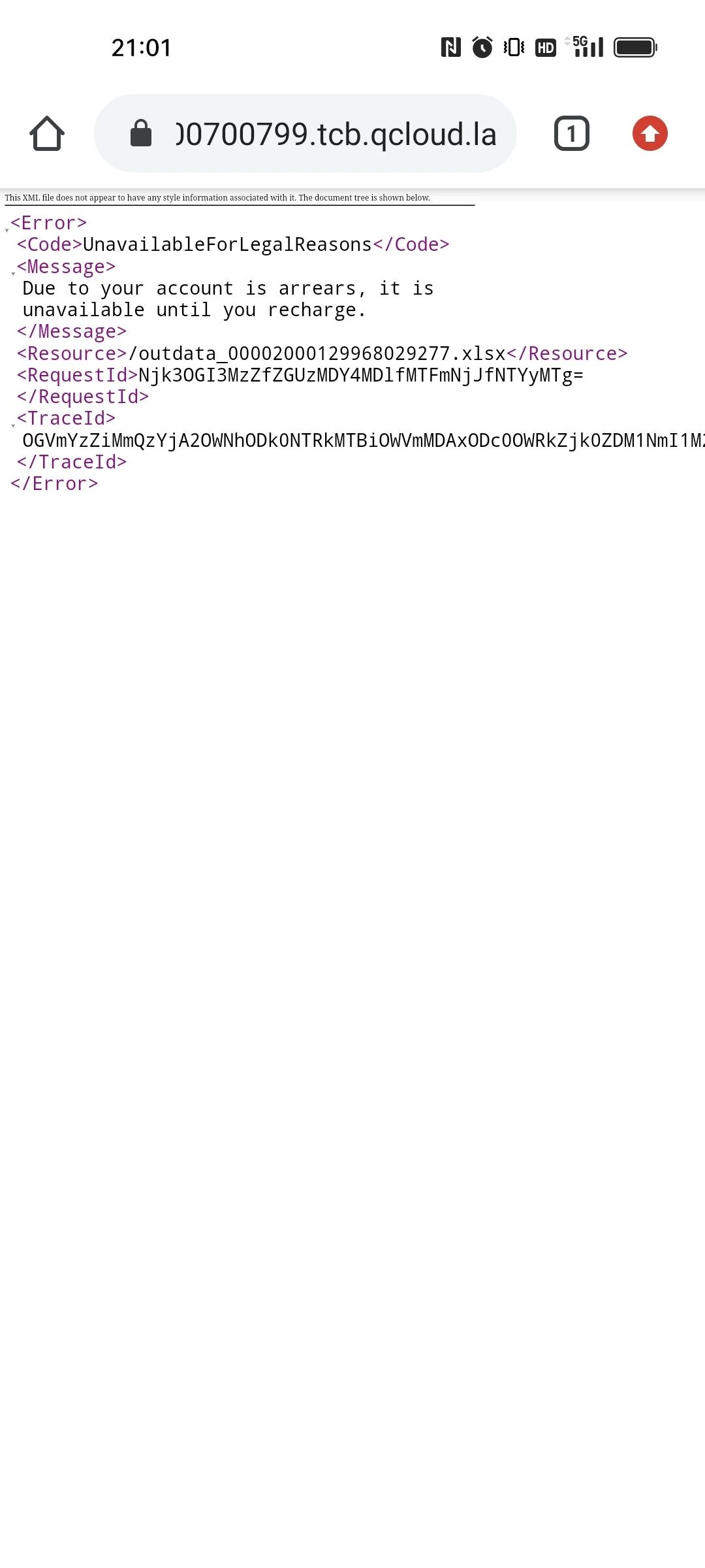 微信云已缴费,为何下载小面小程序生成的文件提示欠费?https://6378-cxgmachine-zyci1-1300700799.tcb.qcloud.la/outdata_00002000129968029277.xlsx
