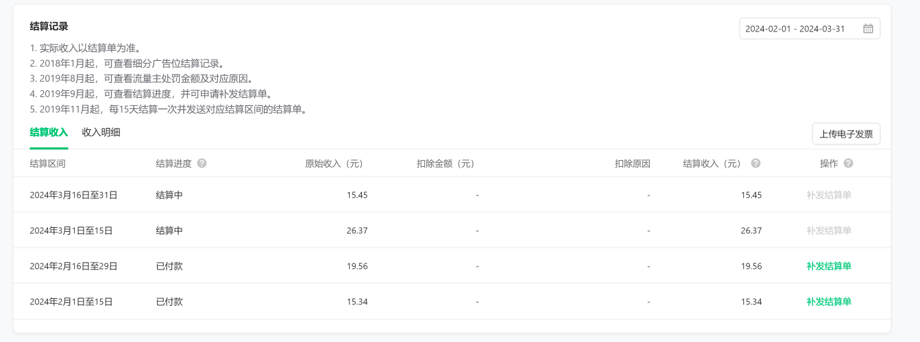 从3月份开就没有结算,中途咨询过一次客服,说是会进行补结算,就没在管。