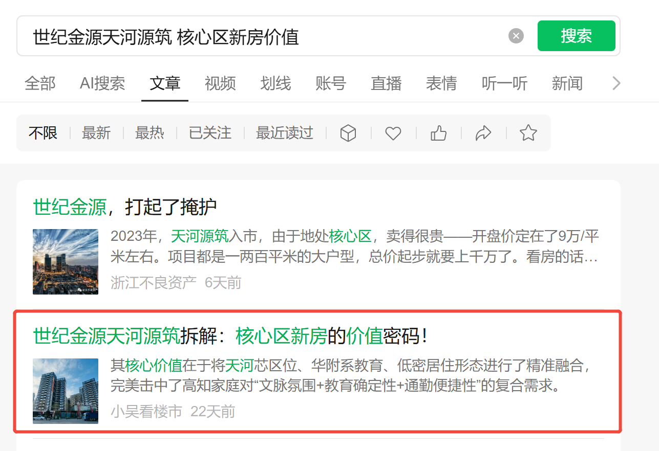 例如这篇文章搜索楼盘名称,也就是关键词:世纪金源天河源筑,根本就看不到我的内容,能看到也是排在4-50名以后,限流后,无论我怎么发文,永远都是排在后面!