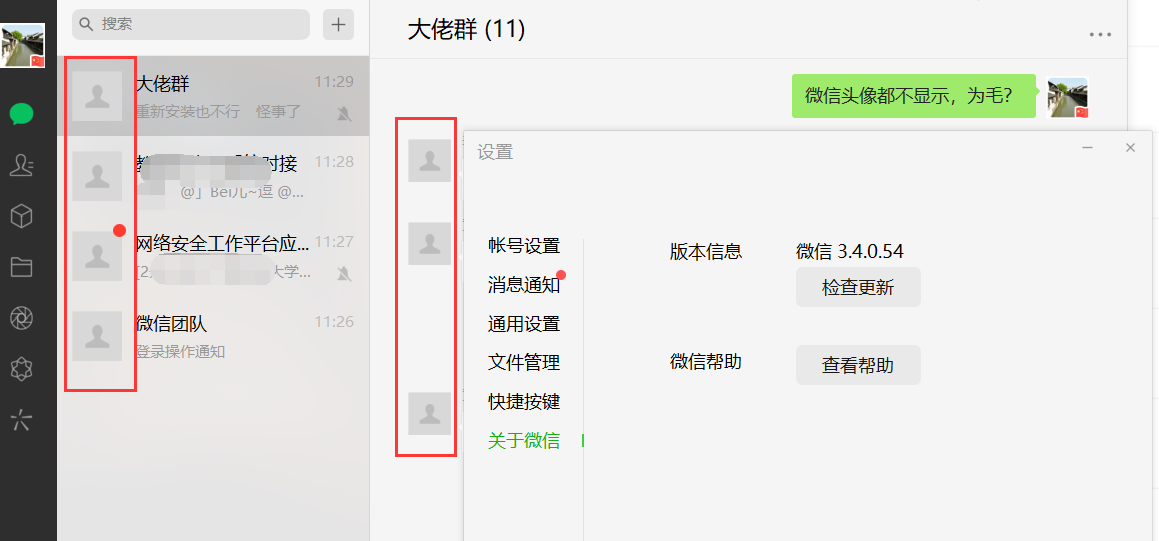 Windows11 专业版。2021-12-9微信自动更新后,所有微信用户头像都不显示,小程序也打不开,订阅号公众号链接也打不开(之前都没有这种问题)。卸载微信重新安装也没作用,同一个网络的同事都没这种问题(网络不存在问题)