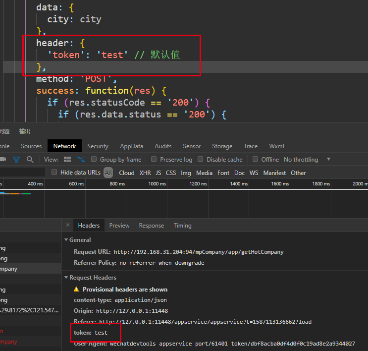 wx.request({ url: 'test.php', //仅为示例,并非真实的接口地址 data: { x: '', y: '' }, header: { 'content-type': 'application/json', 'token':'aaaaaaaaaa' }, success (res) { console.log(res.data) } })token?token你放在header里面?