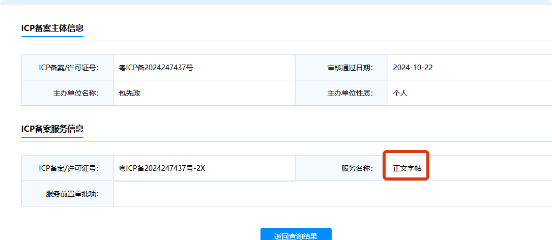 备案成功后有变更小程序名称哦。备案的是【正文字帖】,当前小程序名称为【正文字贴】。请登录小程序后台,点击【账号设置】=》【基本设置】=》【小程序备案】,点击【变更】,重新提交备案订单就行。