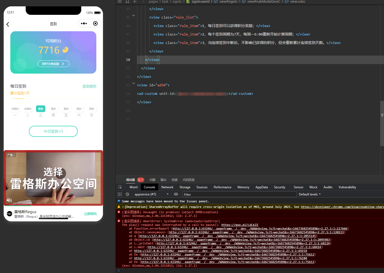 小程序接了流量主广告,凡是有广告的页面控制台都会报如图所示错误,正常功能没影响,但是红色的一大片看着很不友好。
