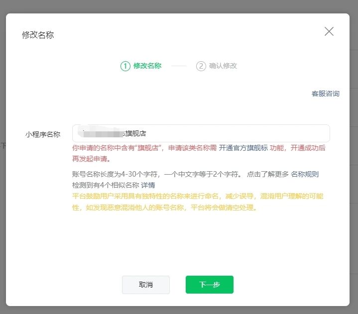 小程序A原先叫XXX旗舰店,由于公司业务我们被划到了新公司,又注册了一个新的小程序B,(因为想着继续用旗舰店的名词)所以A改名为XXX去掉了旗舰店,新小程序运营两个月后发现有不少问题,所以想重新使用回原来小程序A名称,前天想先把小程序A改回XXX旗舰店,结果出现了问题。