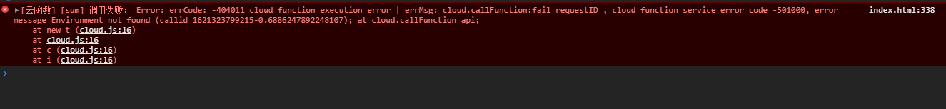 index.html:338 [云函数] [sum] 调用失败: Error: errCode: -404011 cloud function execution error | errMsg: cloud.callFunction:fail requestID , cloud function service error code -501000, error message Environment not found (callid 1621323799215-0.6886247892248107); at cloud.callFunction api;