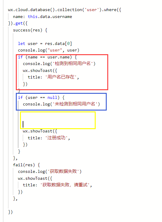 但是在调试的时候,如果用户名未注册过就会出错,调试器里不会打印“未检测到相同用户名”,而是“user undefined”