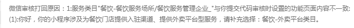 你好,经核实,该小程序涉及为餐饮门店提供入驻渠道、提供外卖平台型服务,请补充选择:餐饮-外卖平台类目。后续代码审核相关问题,可以登陆“小程序服务商助手” 小程序的客服专区联系人工客服进行反馈,客服值班时间为工作日9:00-12:00,14:00-19:00