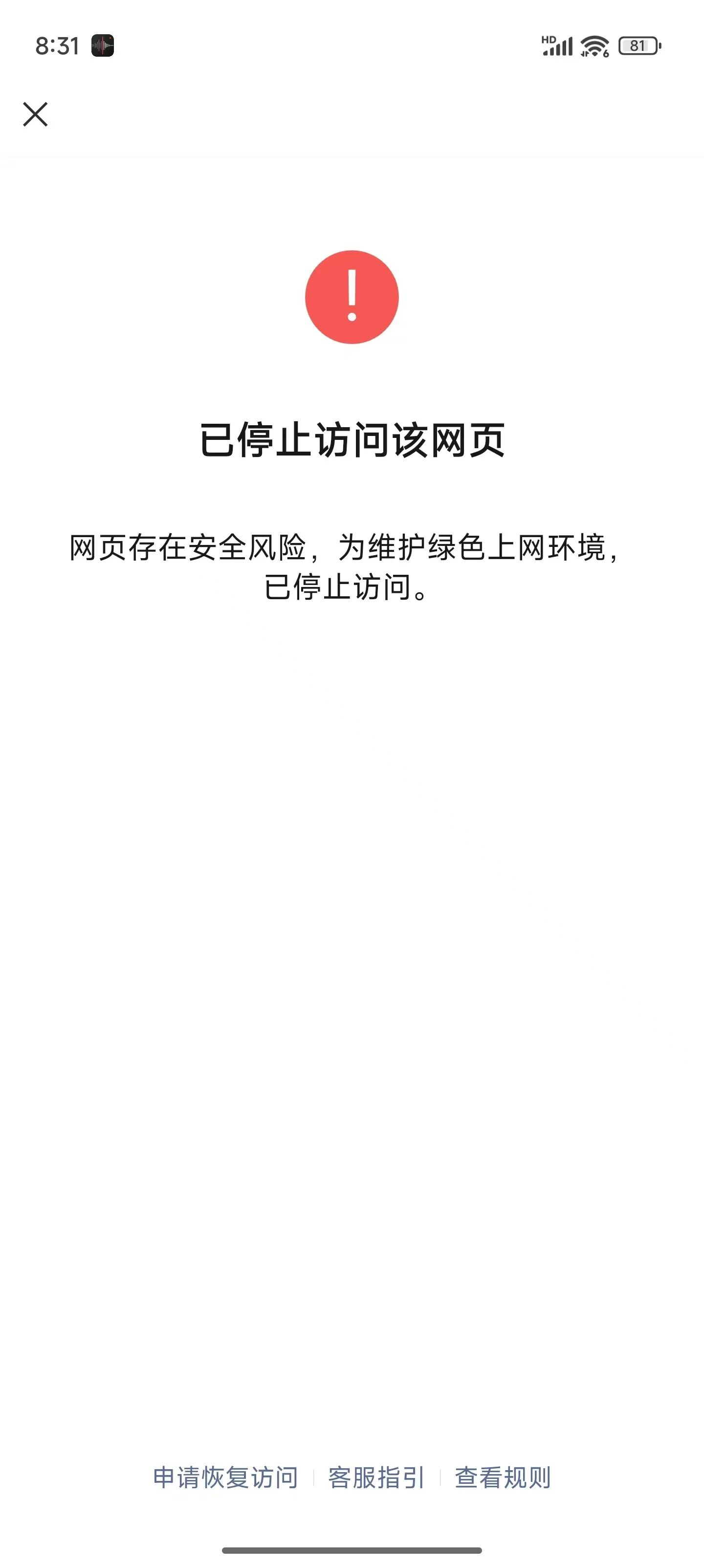 你好,经核实,域名natapp4.cc下的链接【http://yd-cd001.natapp4.cc/prod-api/profile/upload/2025/01/20/62e9bf41-d51b-41ae-aeea-f65ced5a7faf.html?u=dm1794】的内容违反《微信外部链接内容管理规范》的第19条“恶意对抗类内容”,属于严重违规,暂无法恢复微信内直接访问的服务。