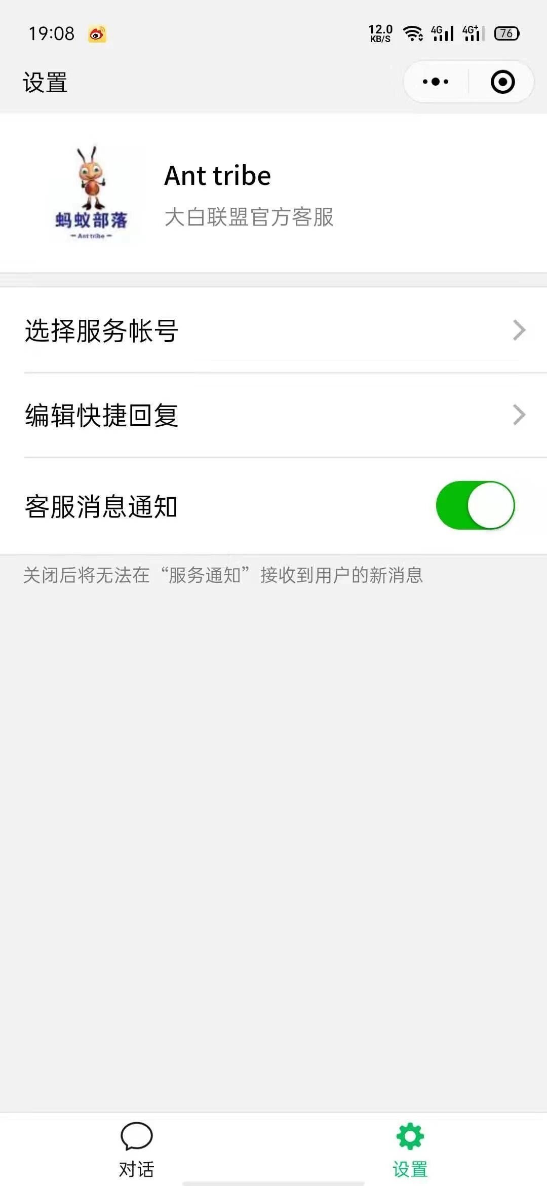 之前注册的是大白联盟官方添加了客服后一切正常,途中更换了一次主体重新注册了一个蚂蚁部落小程序就没有新消息提示开关了并且别人在小程序里联系客服我这边能收到消息就是没有提示音 绑定4个客服都是一样没有提示音,怎么才能有提示音?