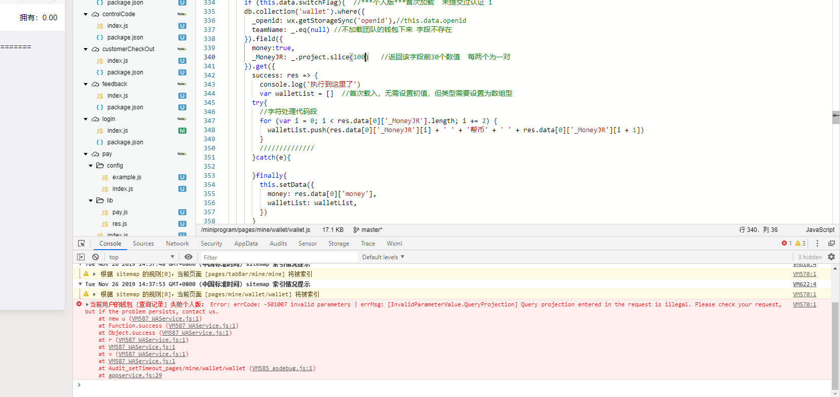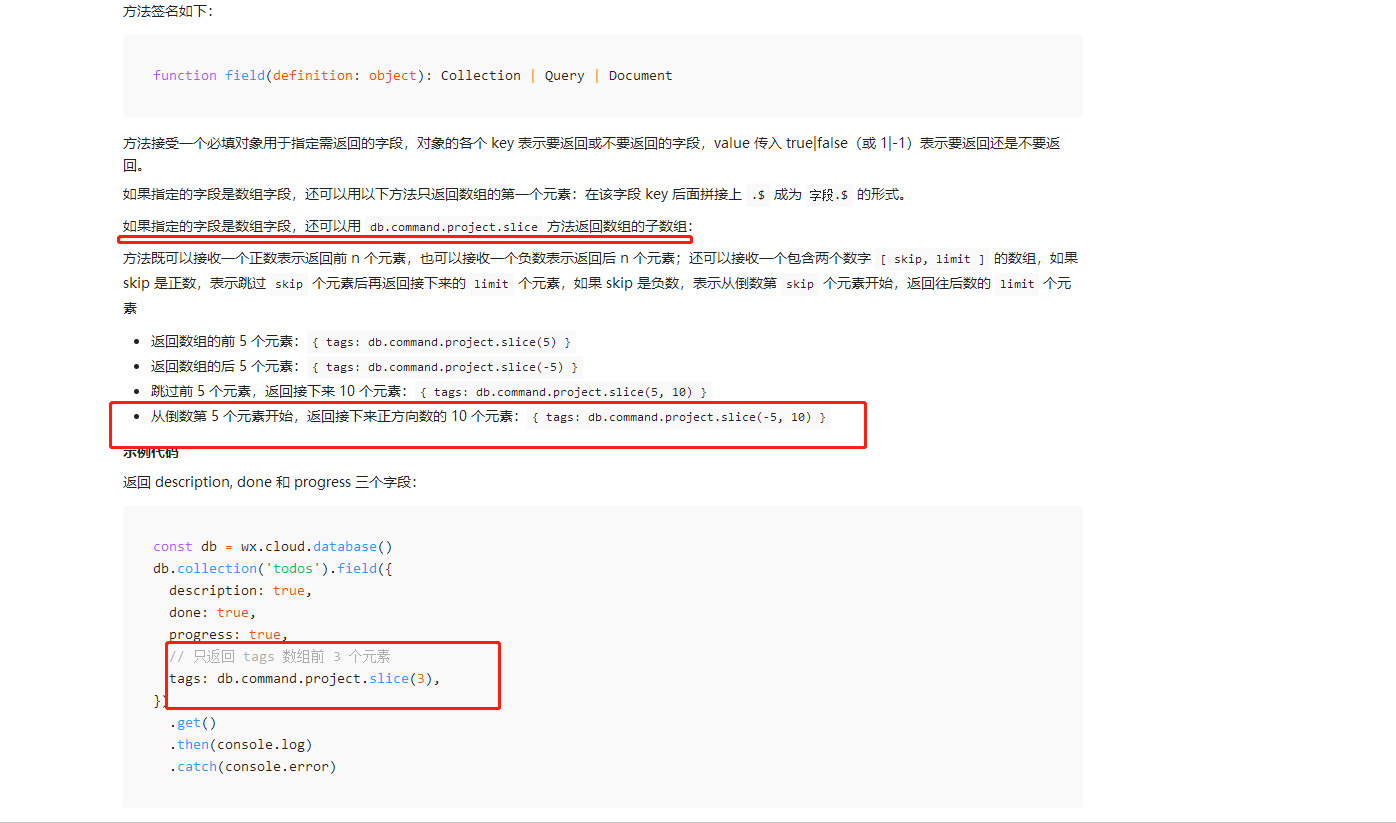 云开发文档中表明使用field函数调用数据的时候可以指定数组要返回的个数,以及返回的起始位置,但是我在小程序端调用的时候 一直报错。我有一个字段是拿来用作钱包流水记录的。我想 按照批次返回到前端而不是一次性全部读取下来,发现这个函数很符合我的意思 但是 一直报错,难道这个是官方预留的吗?还没有推广使用?