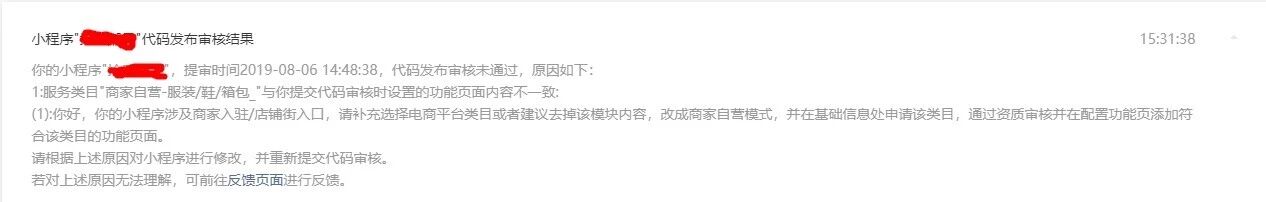 你好,经核实,贵方小程序【我-入驻商】涉及商家入驻/店铺街入口,需补充选择电商平台类目或者建议去掉该模块内容,改成商家自营模式(详图如下)
