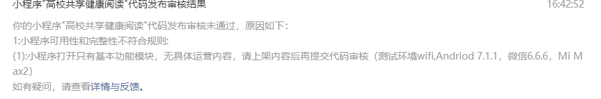 无具体运营内容是什么意思啊?我们这个小程序主要功能并不是在小程序里阅读一本书啊,而是通过小程序查找自己感兴趣的图书然后推荐到自己的阅读器上去阅读。所以图书一般只有该图书的介绍,如果有用户有关注的读者,就可以把该图推送到该读者的阅读器上去。请官方人再次看下,麻烦了 !