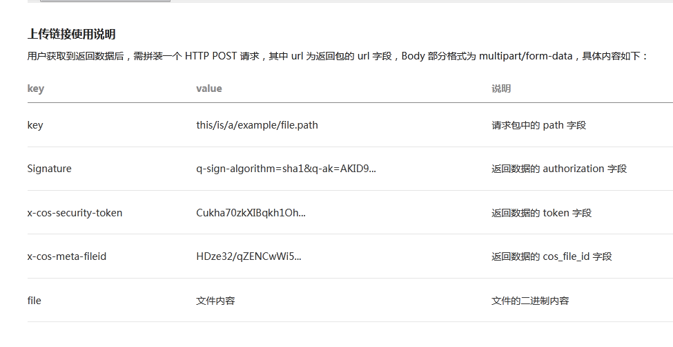 用户获取到返回数据后,需拼装一个 HTTP POST 请求,其中 url 为返回包的 url 字段,Body 部分格式为 multipart/form-data,具体内容如