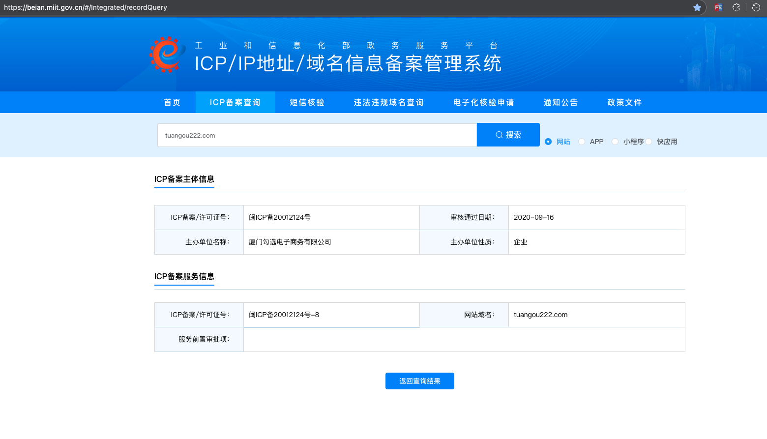 域名【tuangou222.com】为厦门勾选电子商务有限公司正规企业备案域名,备案号:闽ICP备20012124号-8,近阶段因运营需要,及未详细了解微信规则情况下,可能触发微信外链规则。现已删除所有外链,并已熟悉微信外链规则,且在公司内部已严令禁止再次触犯,特申请工作人员再次审核。
