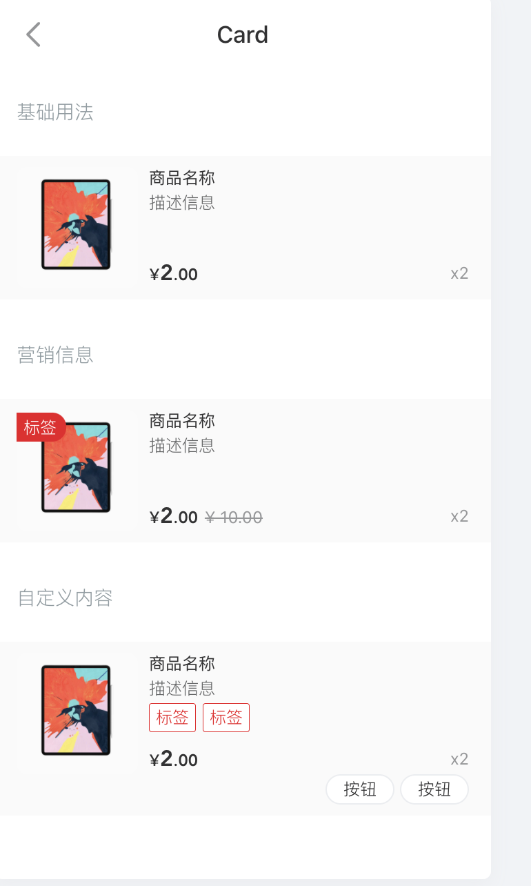 以Vant UI为例,提供了van-card组件,文档如下: