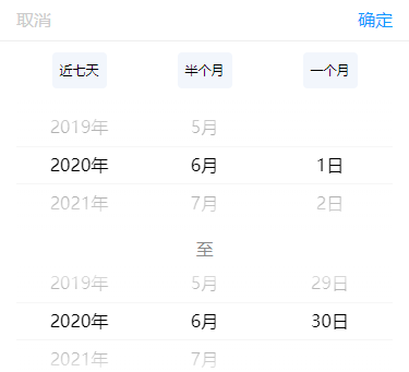 时间范围选择器 开发中经常有需要选择时间范围的组件,只能用picker-view自己封装,如果能带快捷选择就更好了。