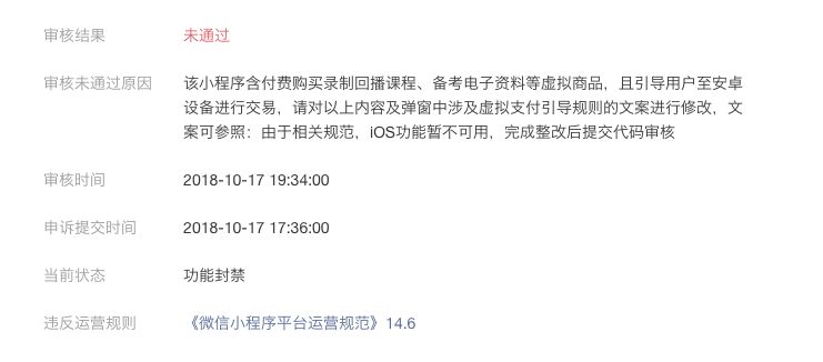 官方工作人员您好,iOS端已经不存在价格展示和引导至APP观看录制视频回放了,也已经提交代码审核通过了,请解封iOS端用户不能打开小程序,谢谢,不胜感激。