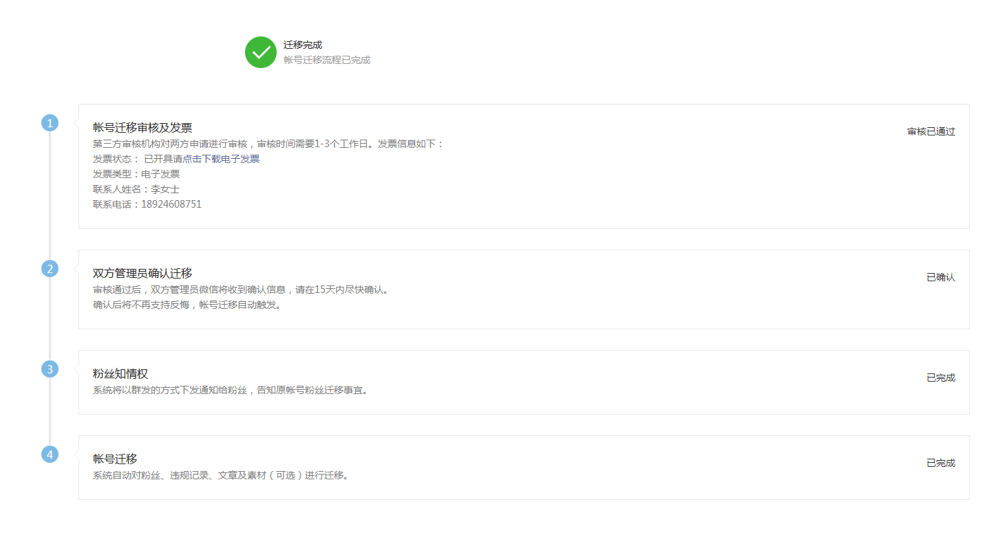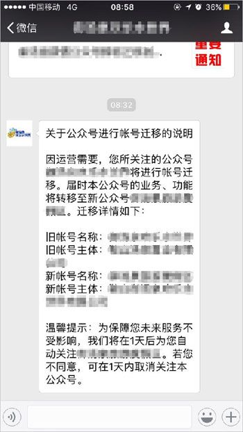 迁移前(即审核通过,双方管理员确认同意迁移后),系统将会在原帐号采用群发文本方式告知粉丝帐号迁移事项,粉丝在1天内可选择是否继续关注;