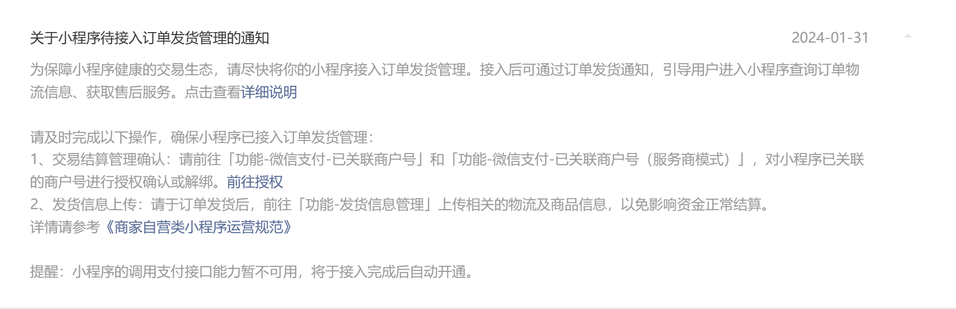 2024年1月31日,我收到如下通知,要求进行服务号关联,才能在小程序进行支付等操作。