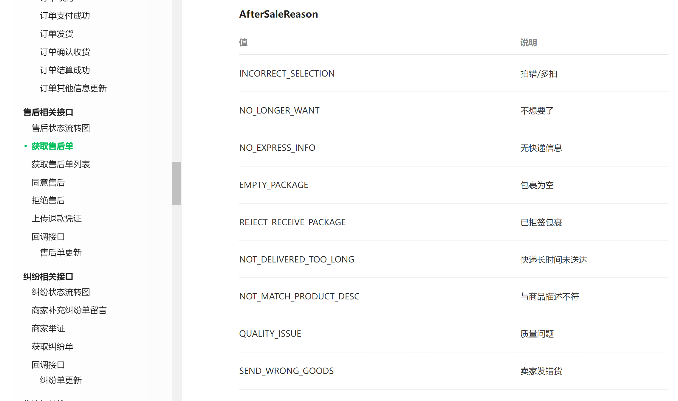 视频的售后原因之前接口是返回英文的,现在返回数值了,请更新一下接口文档,让我们知道映射关系。