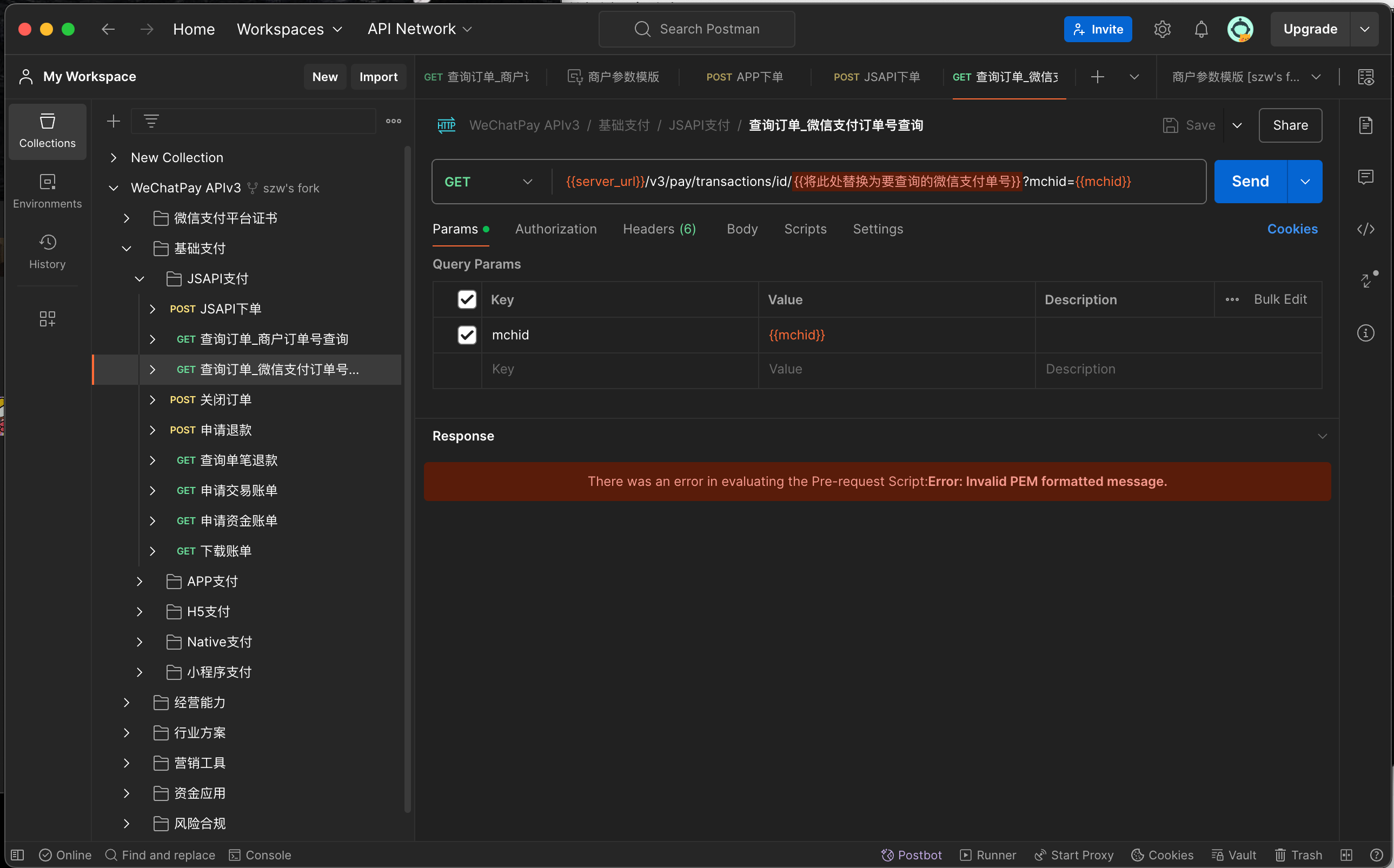 按照开发文档frok进来脚本了,环境也配置了,发送请求就报错这个There was an error in evaluating the Pre-request Script:Error: Invalid PEM formatted message.是为啥啊